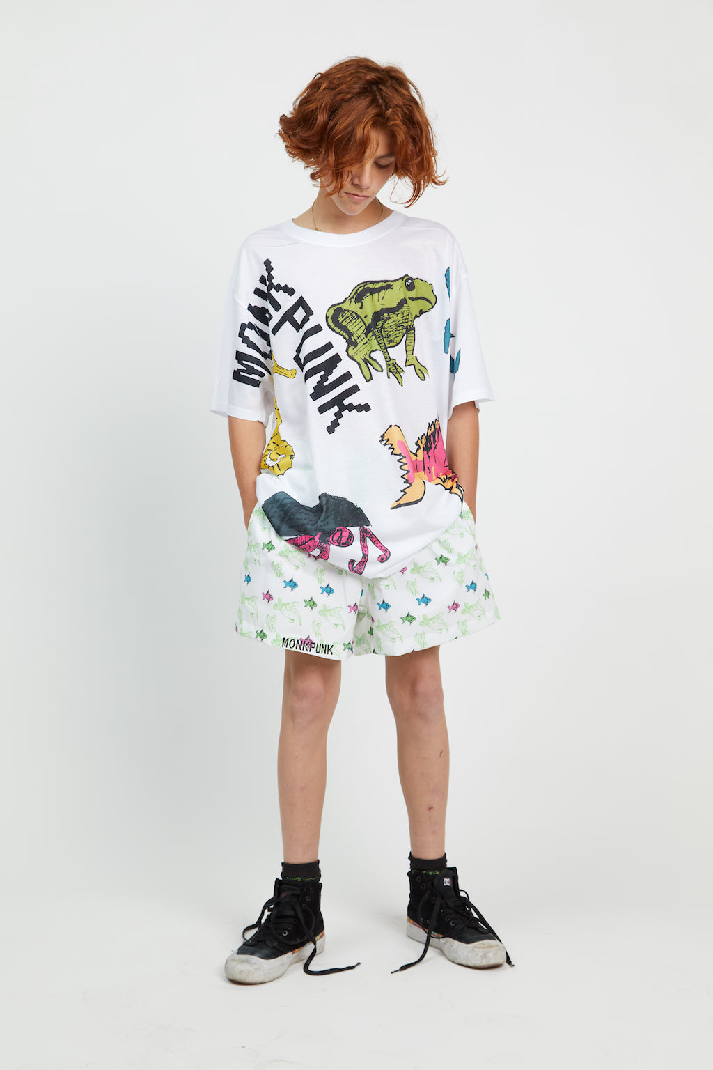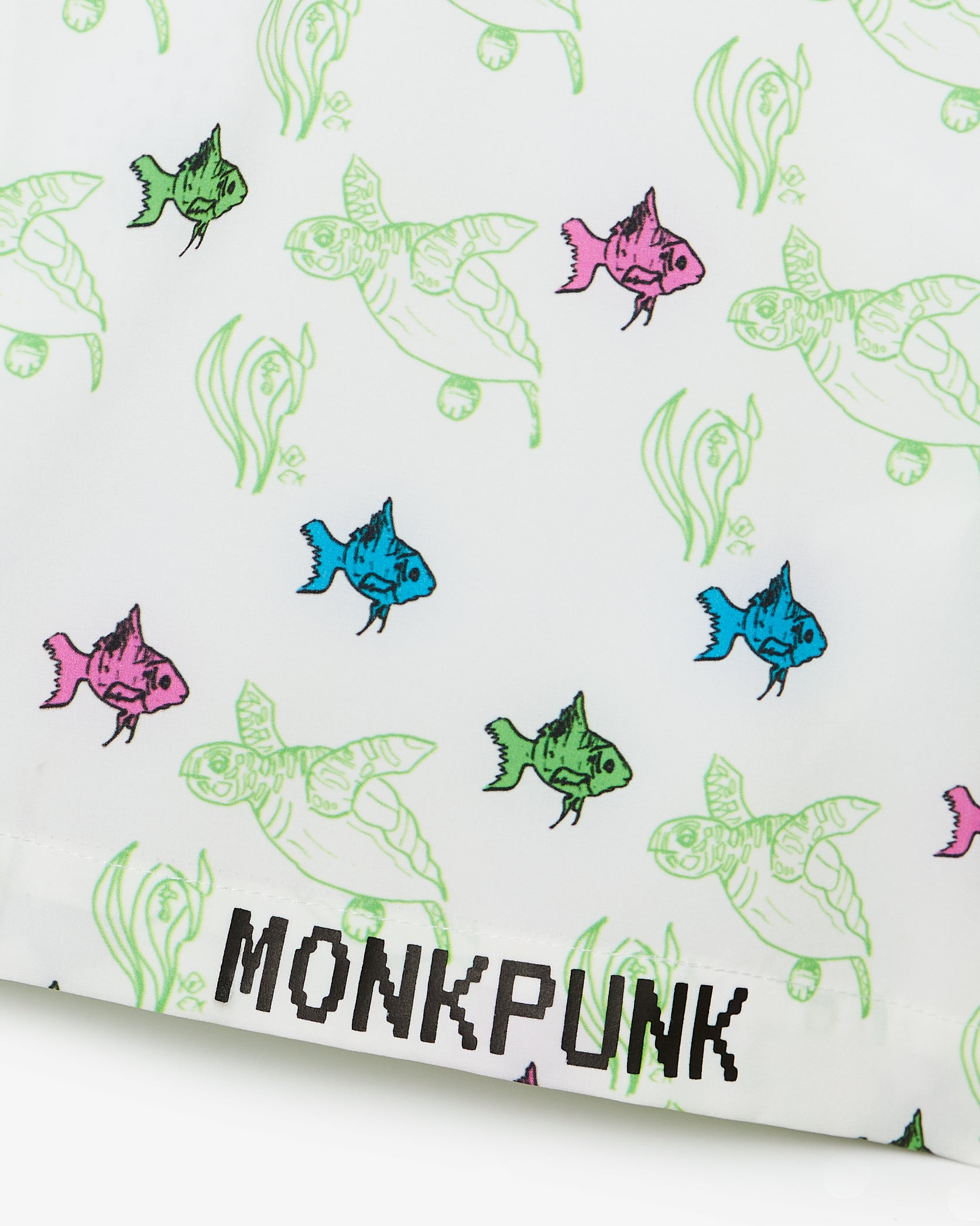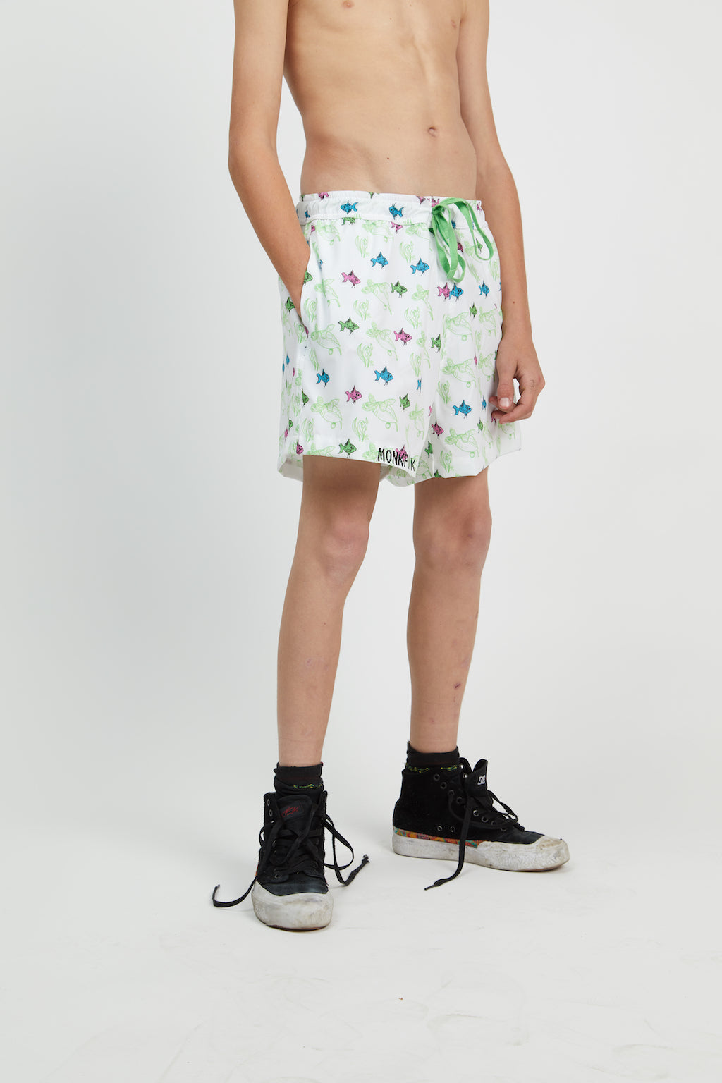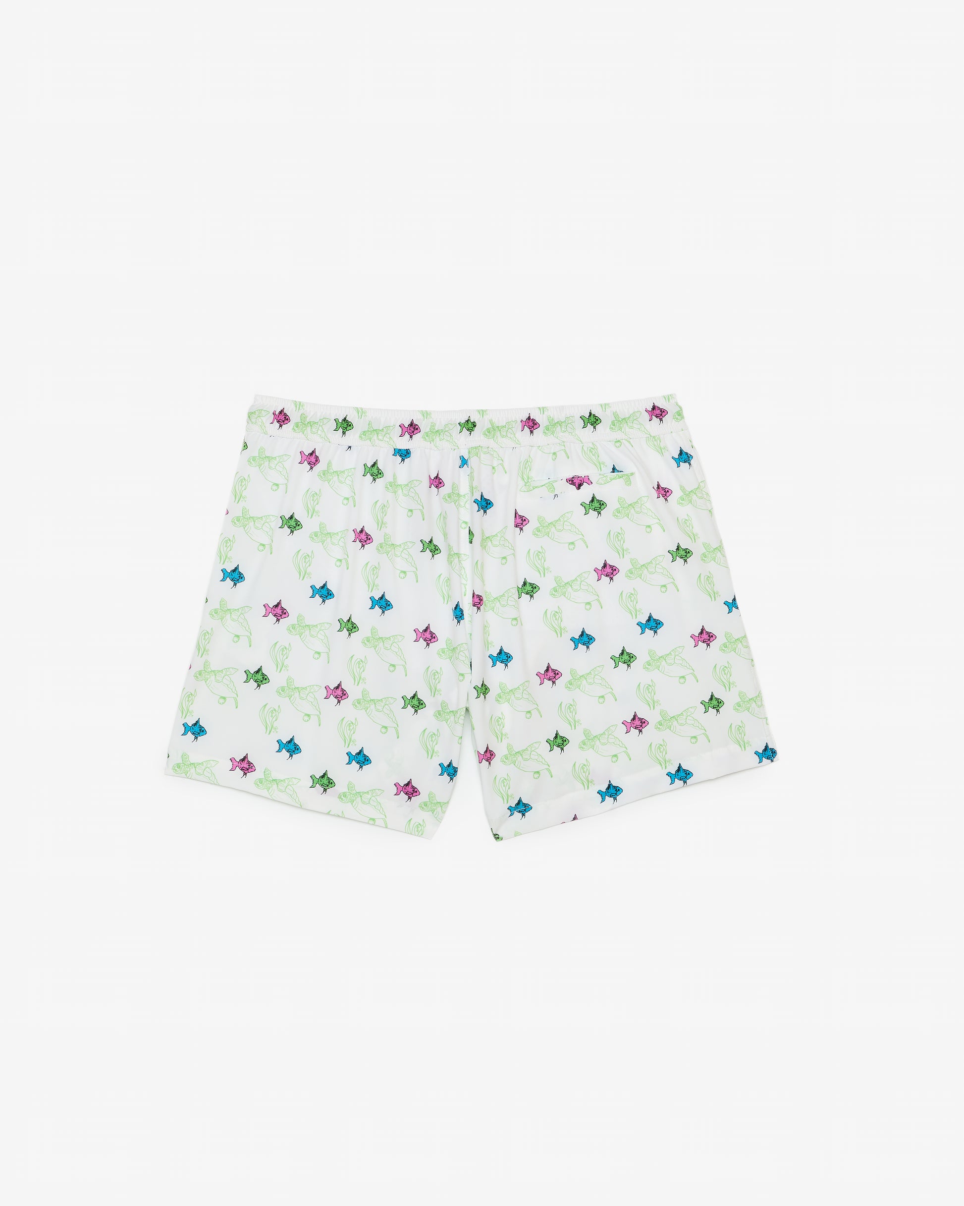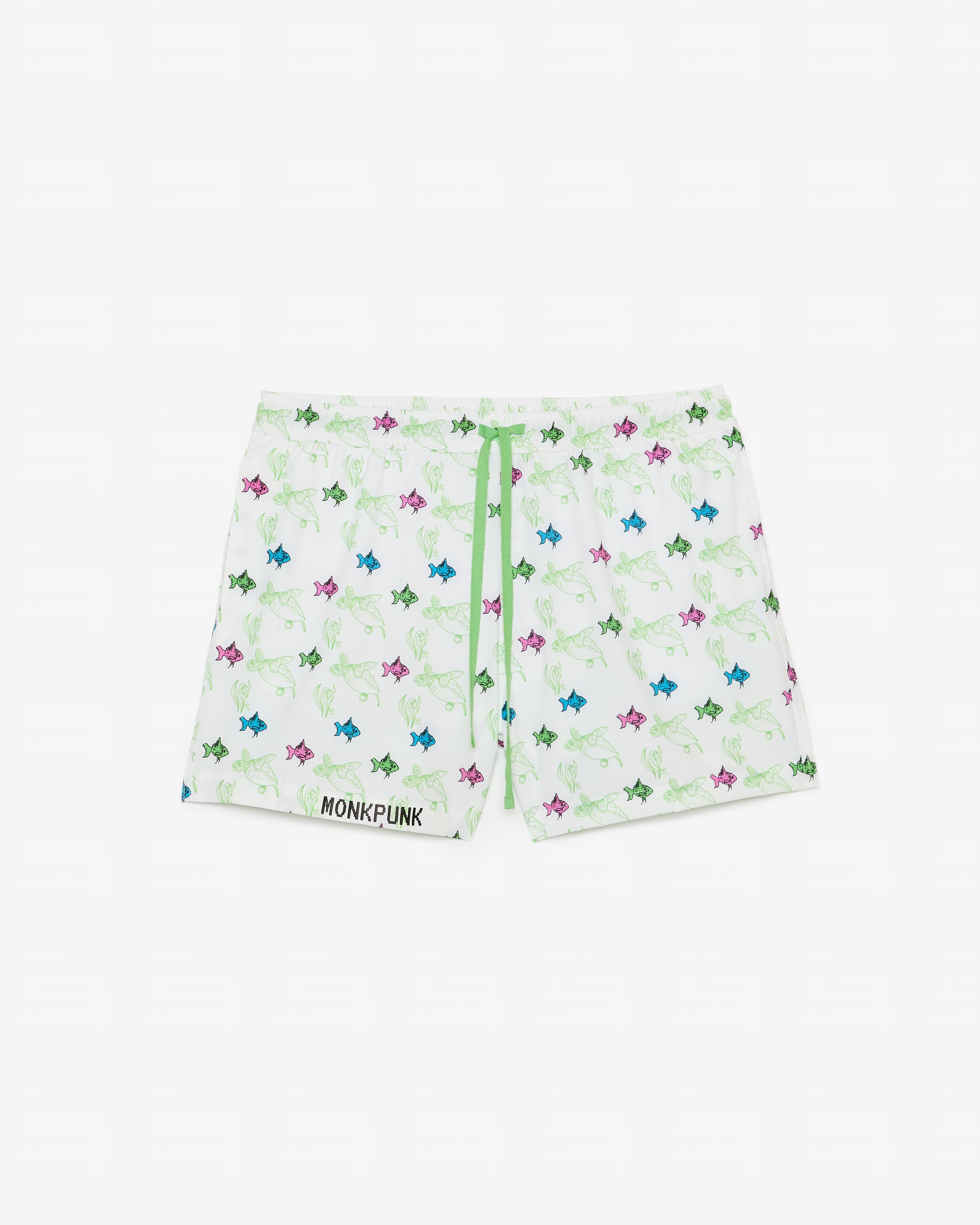 Unisex aquatic athletic/swim shorts with mesh netting interior. Animal print based on hand drawing by Balt Getty.