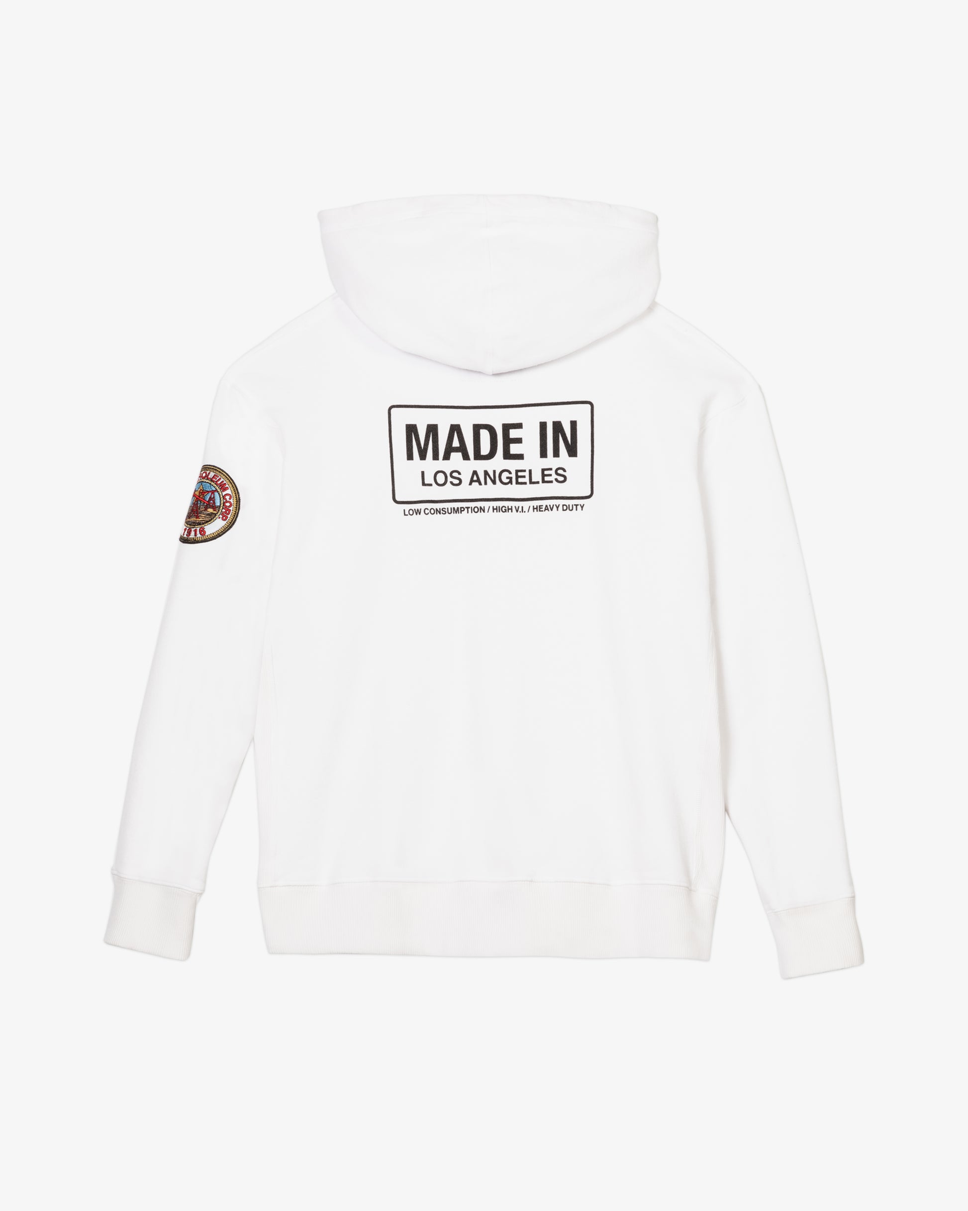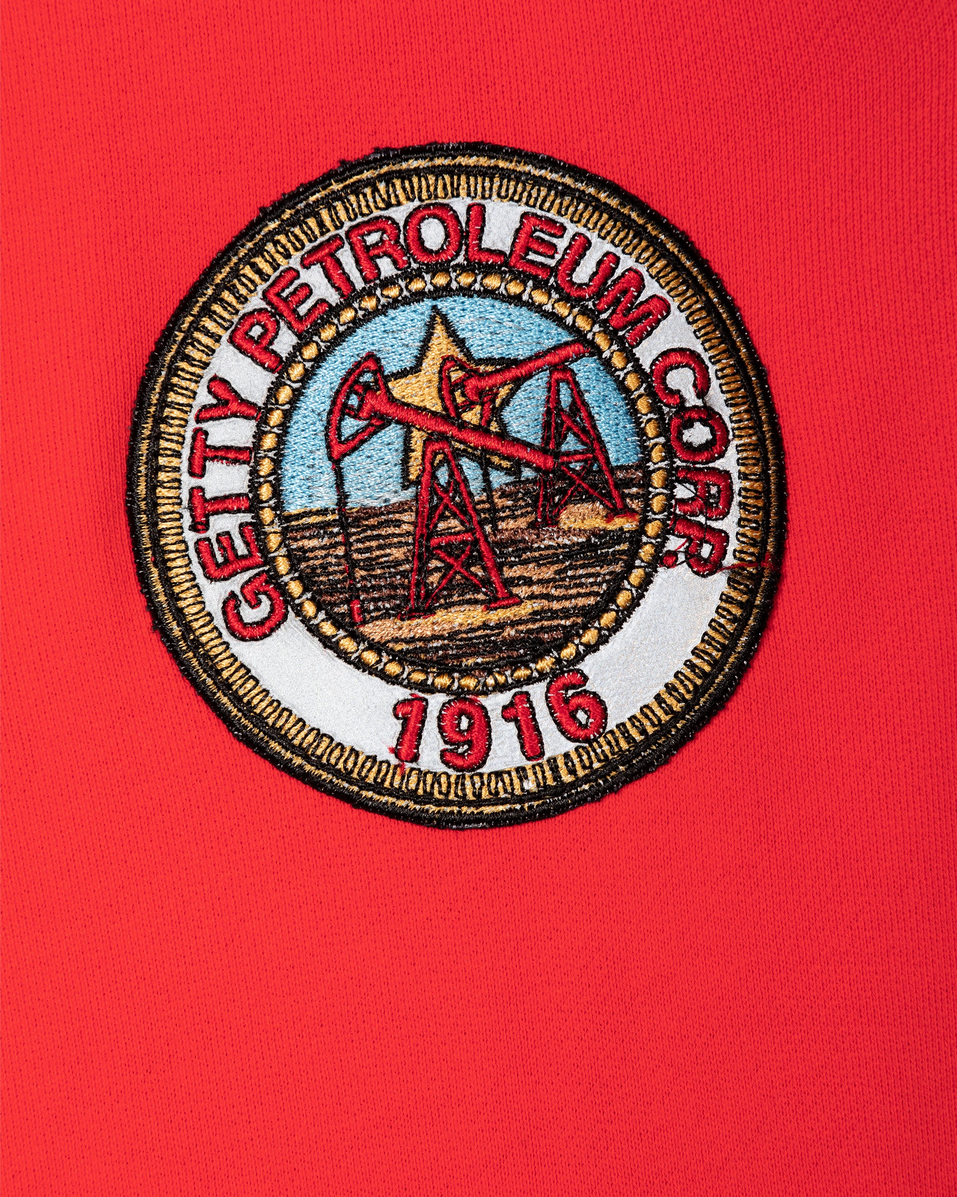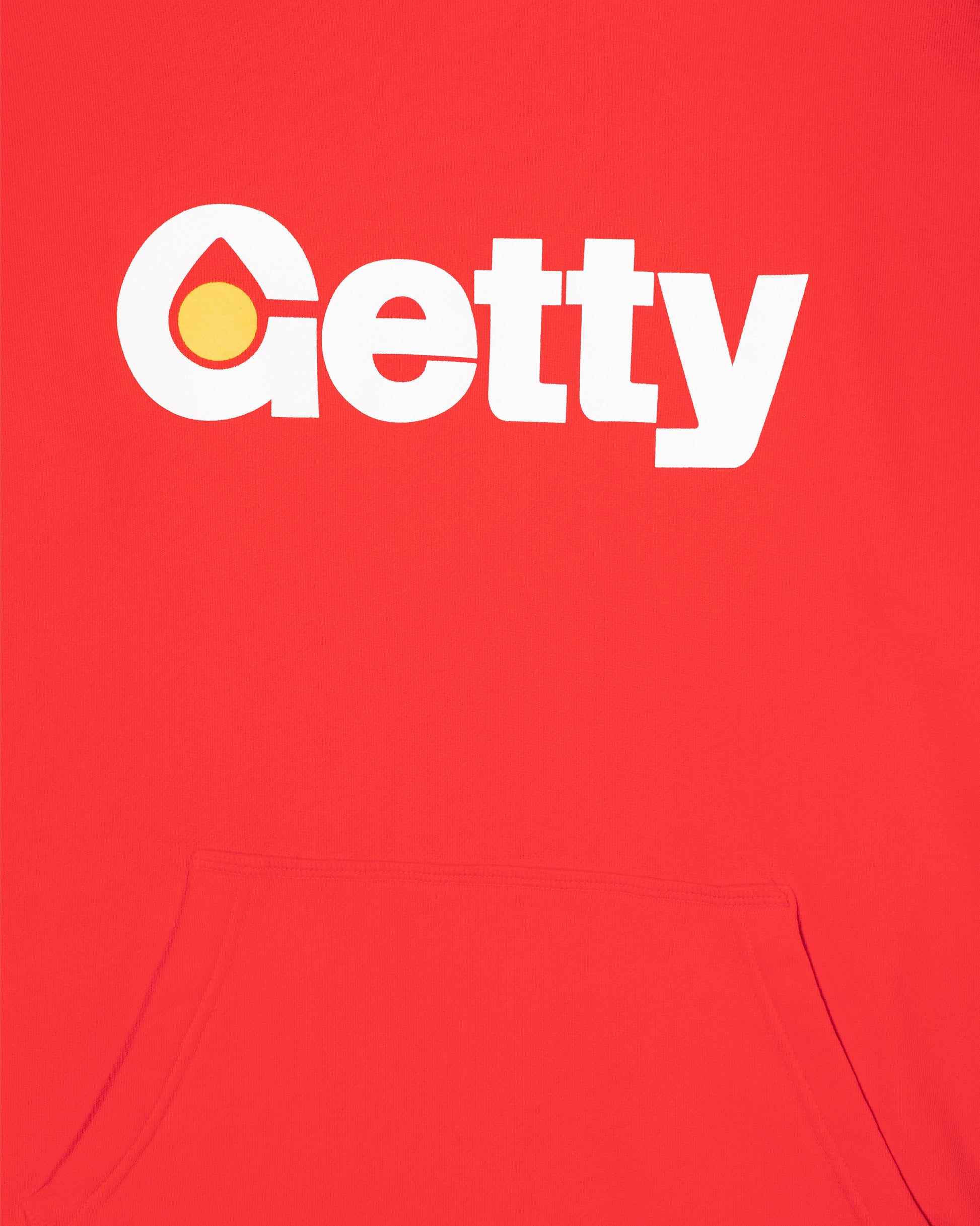 Long sleeve French Terry hoodie with the iconic GETTY logo graphic printed on the front. Made In Los Angeles printed on the back and the classic Getty Patroleum patch on the left sleeve. Featuring a kangaroo front pocket and dropped shoulders. Each piece is unique and print distressing my vary per style. Each garment is finished with our signature sundry process. In white and racing red.