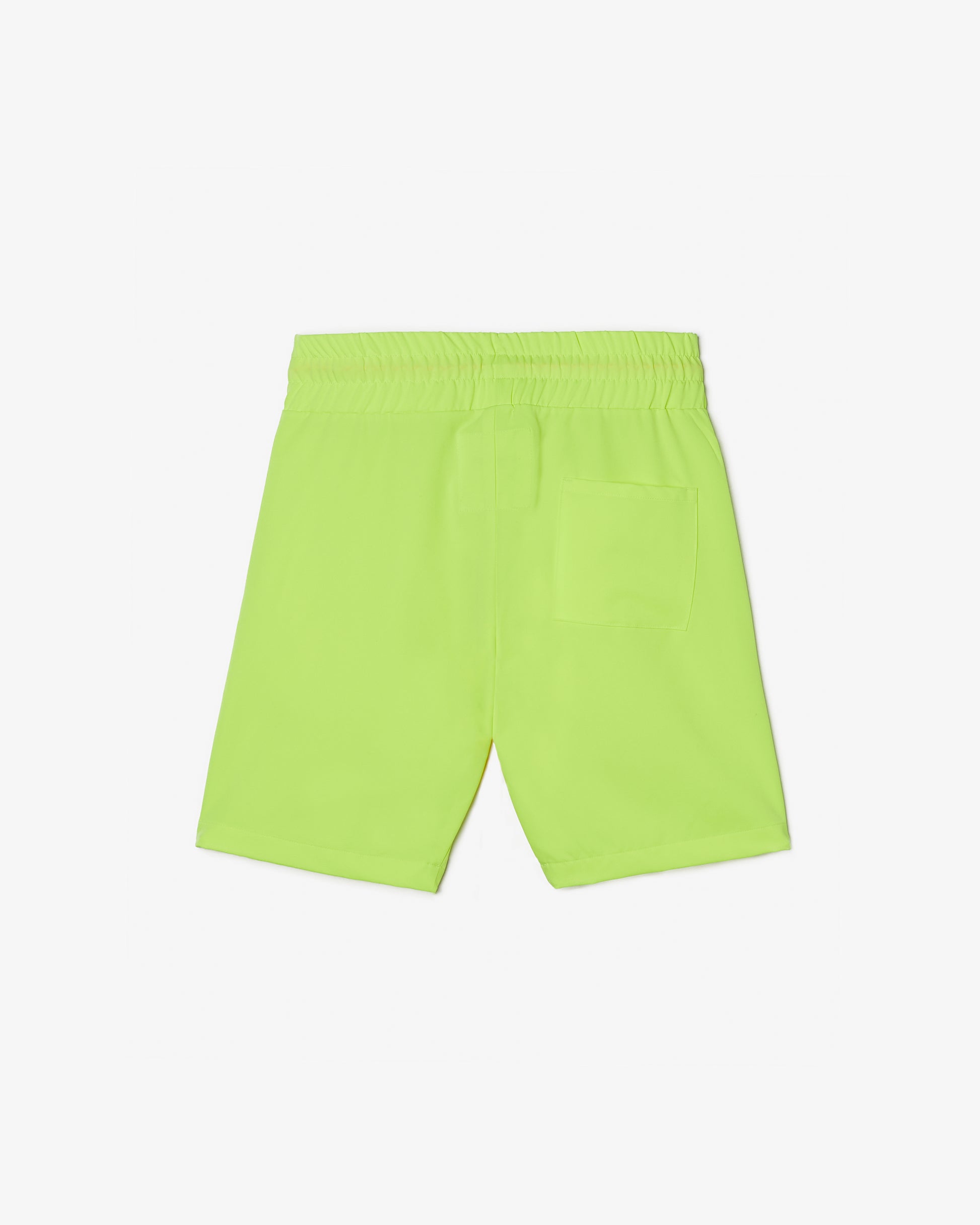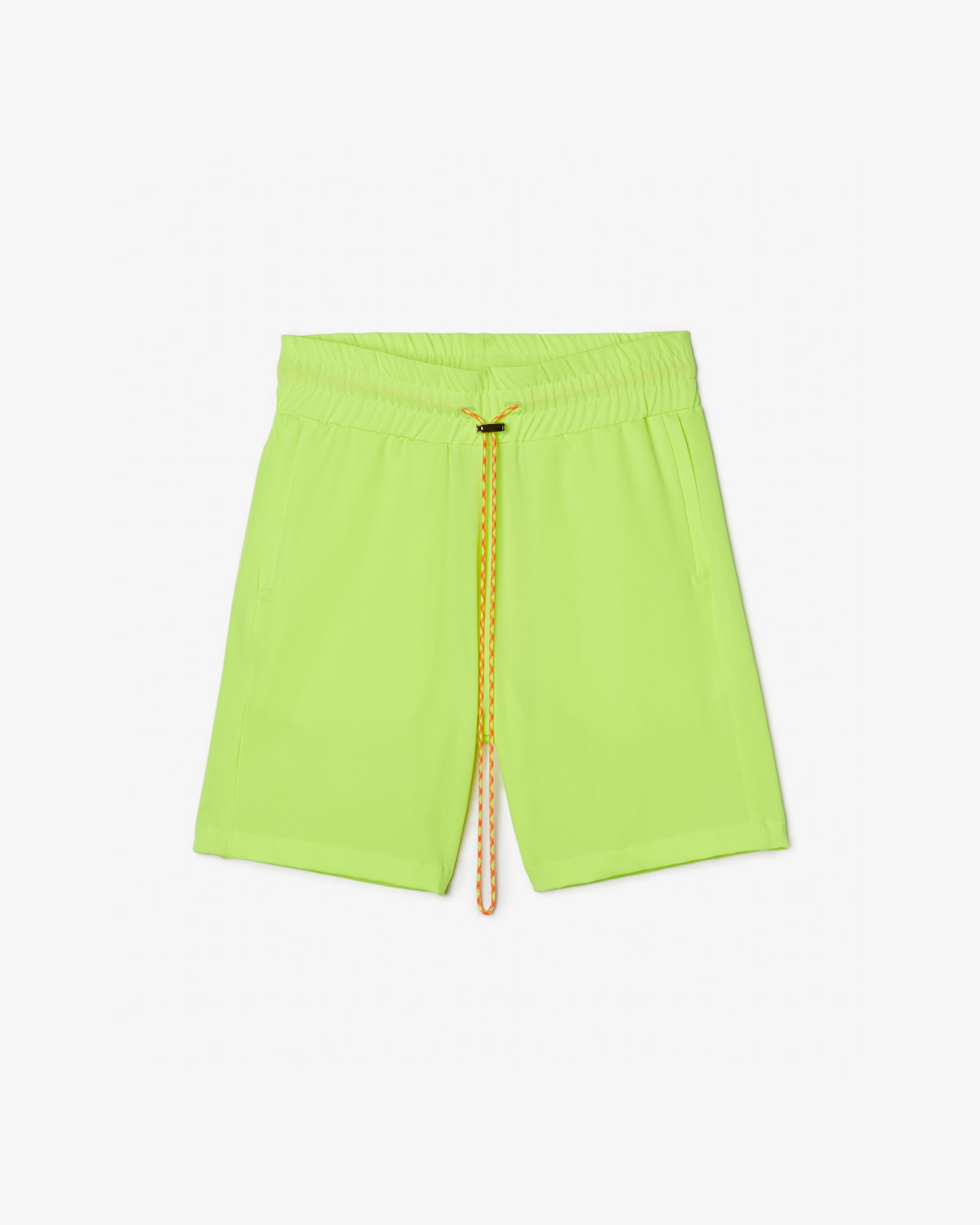 Custom cut and sewn athletic shorts. Orange and yellow drawstring.