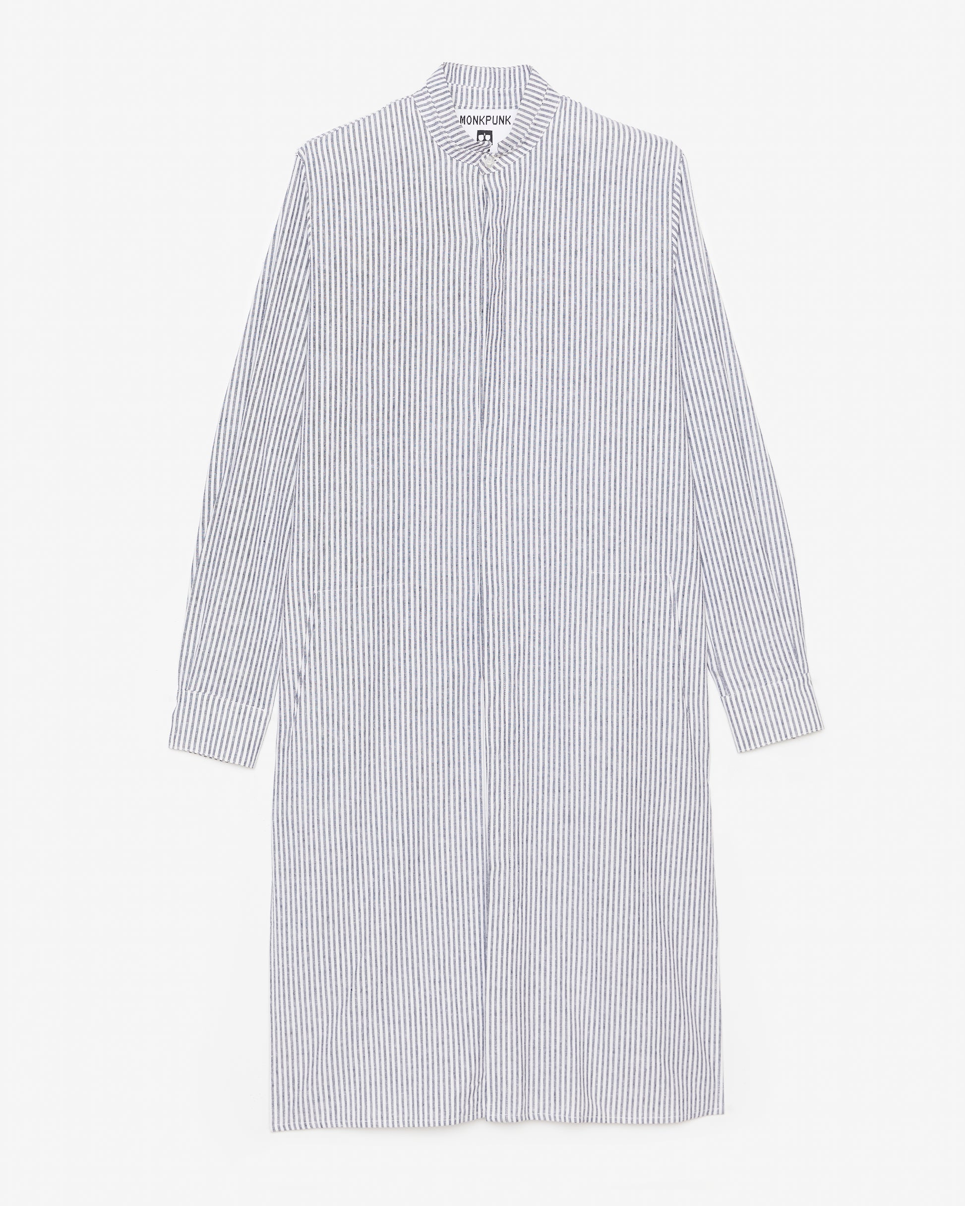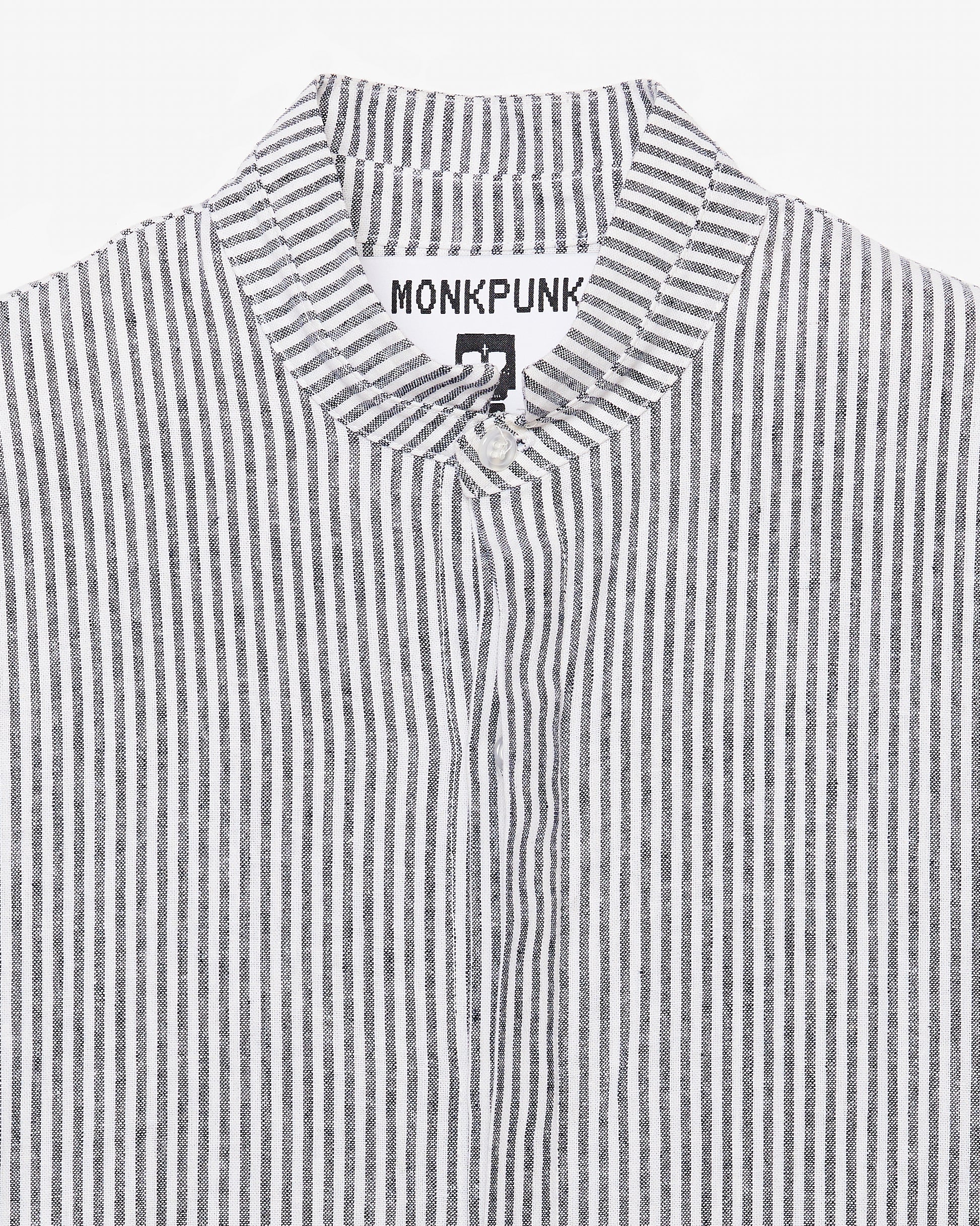 Grey and white pinstripe. MONKPUNK logo and skull tag.